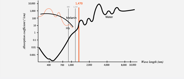 - Veincare is equipped with 1470 nm laser which has much higher water absorption than other lasers, therefore it enables to be treated much faster with low power than others-980 nm, 1064 nm or 1320 nm
