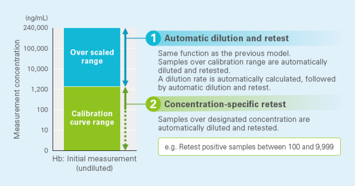 An automatic retest system evolved from the previous model is adopted. A concentration-specific retest function has been added to the automatic dilution and retest function, which was highly evaluated by users.
