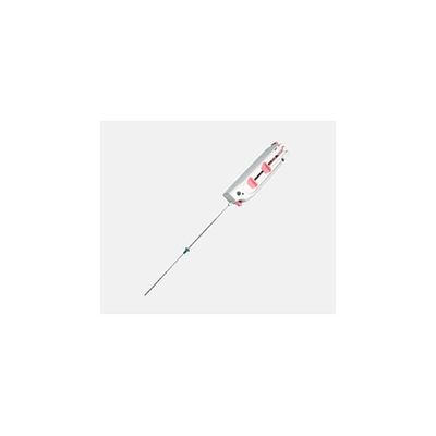 Disposable needle for biopsy on soft tissue with guillotine system. Easy to use, light and compact. The spring-operated firing mechanism is calibrated to ensure the sampling of tissues even more compact. The device has two shots: the first shot has a cutting depth of 10 mm, the second step has a depth of 20 mm. The echogenic spindle has an internal hollow collecting a large sample. The centimeter cannula allows to detect depth of the lesion and has sliding stopper.