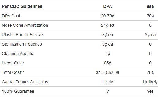 Think about never having to clean, lubricate and autoclave a straight attachment again. And when you consider the cost of cleaning and autoclaving, esa actually costs less to use than other disposable prophy angles with traditional handpiece connections.