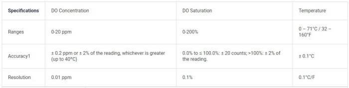 - Calibration Methods: 1 or 2 Point; 0 ppm DO Calibration Solution, Air or Water