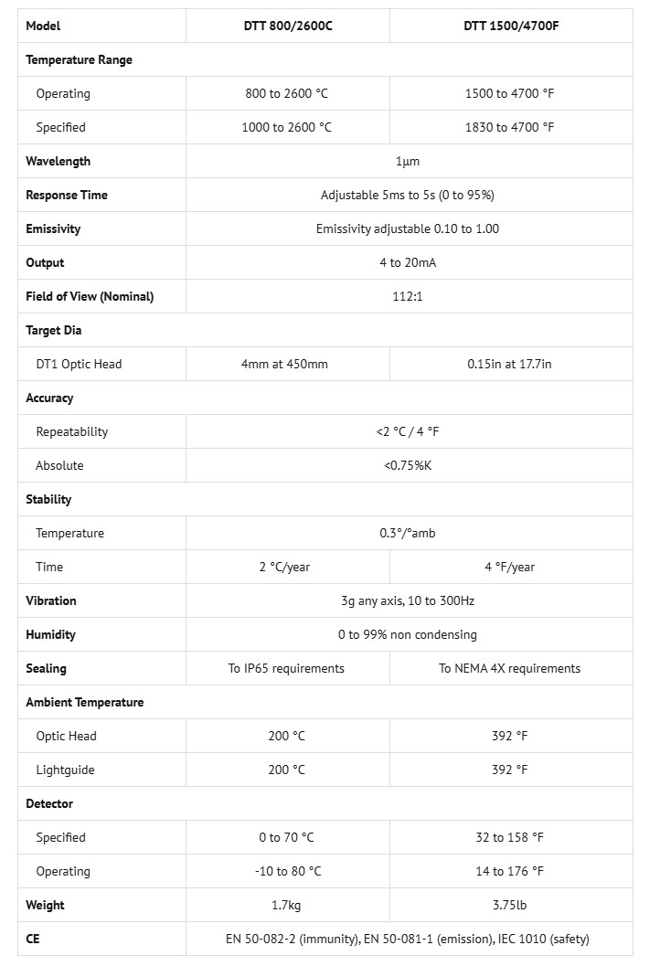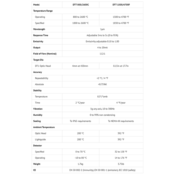 Designed to operate in furnaces with typical temperatures of 2200 °C (4000 °F), the DTT uses a short wavelength and silicon cell detector to provide a stable measurement which responds quickly and sensitively to temperature changes.