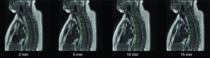 The drug delivery principle’s functionality was demonstrated via MRI (magnetic resonance imaging), using the fully developed device loaded with a contrast agent. The trial showed that it is possible to deliver a mucoadhesive film to the esophagus by rolling off from a capsule during swallowing. It was found that the film rolled off in all healthy volunteers participating in the study and was correctly placed and attached to the esophageal mucosa in each single case. MRI images were generated at different time points after application. It was determined that the film is visible on the esophageal mucosa for at least 15 minutes. This is significantly longer than the contact time of less than one minute for oral orodispersible tablets (Burton et al., 1995; Washington et al., 2000). The general swallowability and acceptance were very good and no severe reactions (e.g. vomiting) were observed.