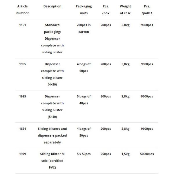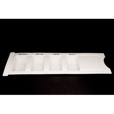 Dimensions M: 220 x 60 x 15 mm. Made of polypropylene. With clear sliding lid, made of certified PVC. With 4 compartments, securely dispenses medications (pills). With Braille. Food contact approved. Commonly used in hospitals or in long term care homes, with all the pills a patient needs for each dose lumped into one sealed blister pack. Disposable product. Possibility to use acrylic dividers to divide each compartment. Possibility of print a trademark.