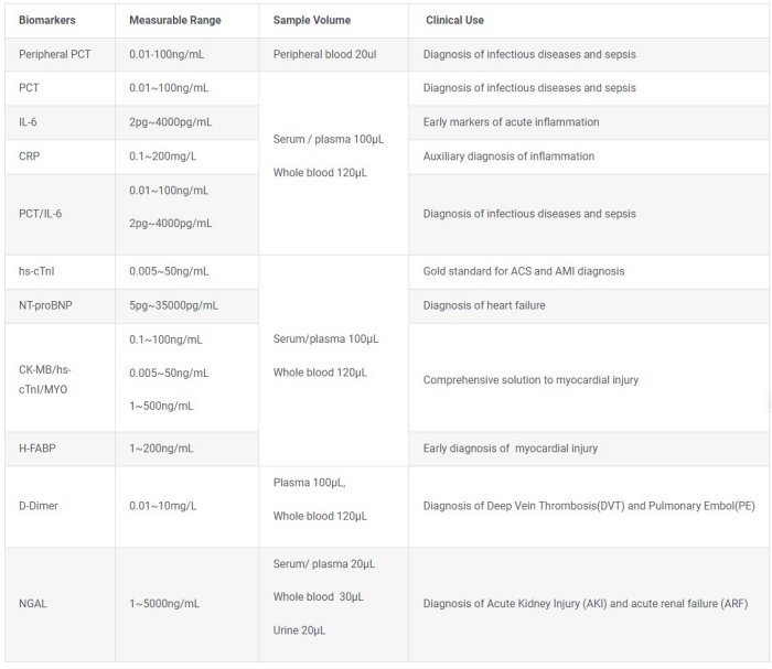 Dry Immunofluorescence Analyzer is used for in vitro quantitative detection of various indicators in human serum, plasma, whole blood, and urine.It is mainly used to detect the contents of PCT, hs-cTnI, NT-proBNP, H-FABP, CK-MB, MYO, D-Dimer, NGAL, etc., and the results are used for clinical auxiliary diagnosis.