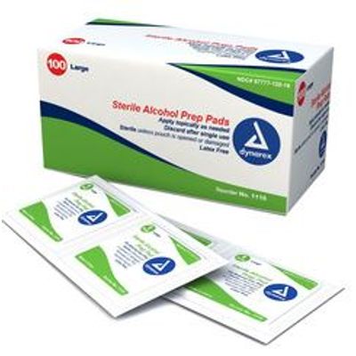 Large, sterile, non-woven alcohol prep pads saturated with 70% isopropyl alcohol. Comes in a box of 100. Manufactured by Dynarex. Length folded: 1.77 inches. Length unfolded: 3.54 x 1.18 inches.