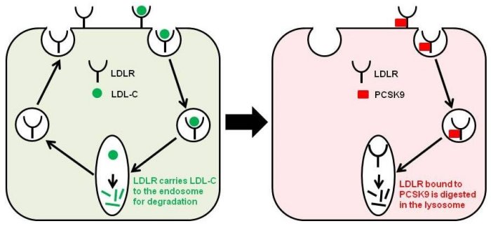 LDLR is a cell-surface receptor that binds LDL-C and carries it into cells to the endosome for degradation and thus reduces the plasma level of LDL-C (Figure 1). However, PCSK9 controls the degradation of the LDLR in the liver (Figure 1) and thereby contributes to cholesterol homeostasis.