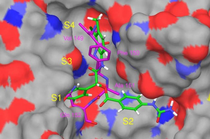 Figure 3: Ligands docked in the PCSK9 active site. P-1 (green) and tetrapeptide (magenta) terminus of processed N-terminal domain shown bound and superimposed in the active site of PCSK9. The position of P-1 is from docking studies, while that of the tetrapeptide was experimentally determined. Positively charged surfaces (red), negatively charged surfaces (blue), and neutral surfaces (grey) of the enzyme are also indicated. S1 to S4 represent the PCSK9 subsites. The various amino acid residues of the tetrapeptide are labeled in magenta.