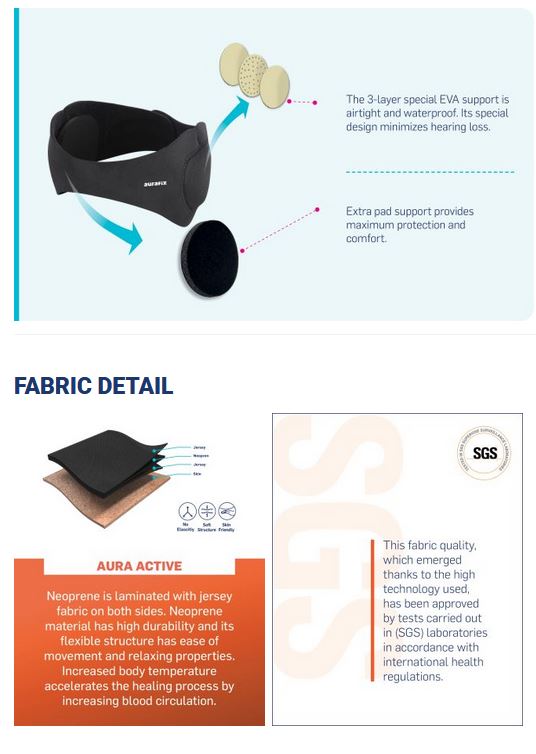 It is an ear bandage made of neoprene (Auraactive) material designed according to the anatomical structure. Thanks to its special material, sound waves are not blocked in the protection area and does not cause hearing loss during treatment. Maximum comfort is provided with extra protection sponges that can be attached to the inside with Velcro. It provides a personalized use with its Velcro bandage.