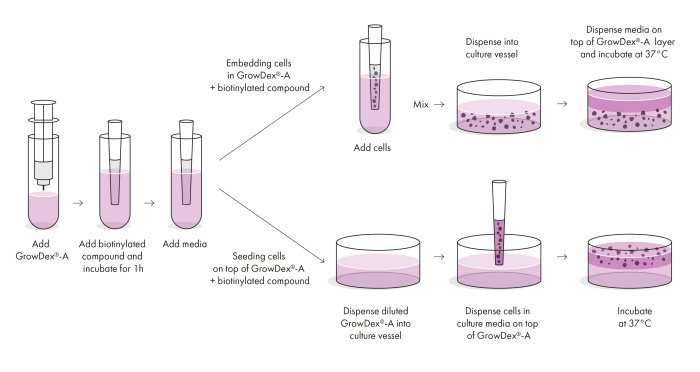 If you are looking to customise your hydrogel then GrowDex-A is for you. GrowDex-A is a transparent hydrogel that has been modified by the addition of an avidin group so you can attach any biotinylated molecule you like. GrowDex®-A is a ready to use, transparent hydrogel that has been specifically developed to bind different biotinylated molecules, whose presence may enhance cell culture conditions for specific 3D applications. GrowDex-A consists of avidin conjugated nanofibrillar cellulose which can be customised by binding different biotinylated molecules e.g. proteins or peptides, to create a cell specific matrix. Ambient handling and shear thinning properties of GrowDex-A enable easy dispensing and use in automated systems.