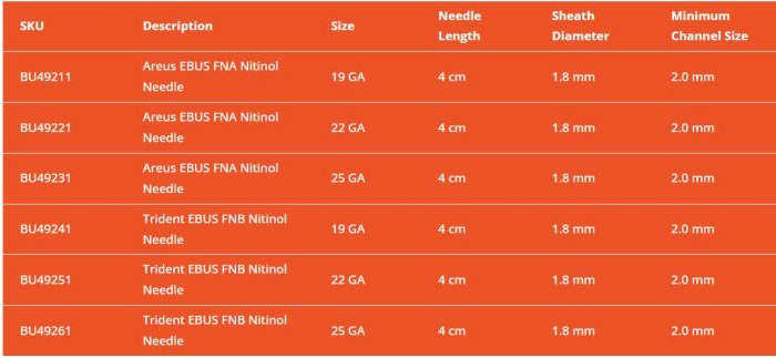 Trident FNB has a unique tri-tip core design to maximize yield and enable consistent tissue acquisition. Areus FNA features an elongated dual edged bevel tip to aid in precise penetration into the target area. Push button adjustors offer quick, one-handed control for needle depth and sheath length. Made of nitinol for superior strength and accuracy. Laser etched V pattern on needle surface provides good visibility under ultrasound.