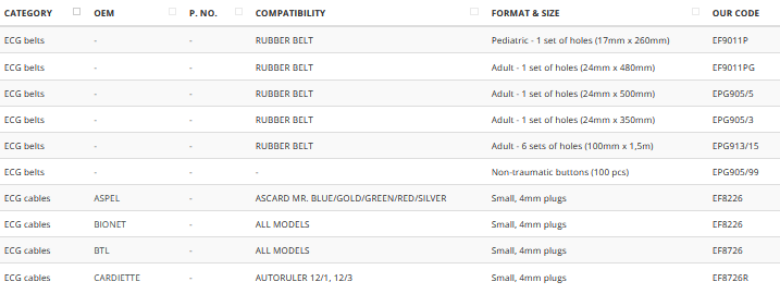 ECG patient cables, leadwires and adapters, along with ECG fastening rubber belts and disposable CTG transducer belts, complete our assortment of cardiology accessories. ECG cables are available both with 4mm plug and snap connection in order to fit the most widely used device models, while ECG and CTG belts are specifically designed for an optimum comfort in use thanks to the sets of regularly spaced button holes.