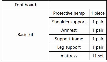 Full length of table: 2100mm. Table width: 500mm. Height adjustment: 750-1000mm. Lean forward: ≥20°. Reclining: ≥15°. Lean left and right: ≥15°. Headboard adjustment: ≥30°. Backplane adjustment: ≥70°. Lumbar adjustment: ≥80mm. Leg adjustment: ≥90°. Leg abduction: ≥90°.