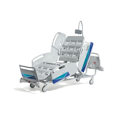 Electric height variable hospital bed with system on levers, 4 sections, retractable backrest, satellite control, double control with protection integrated in the semi-side rails and backup battery. Safety night light and audible alarm signalling connection to the mains which sounds when not braked. Complete with pull-out shelf in HPL with a painted steel structure, and electric extension integrated into the bed frame. Complete with accessory insert supports at each corner for drip stand and patient lift pole. Thermoset epoxy coating with antibacterial additive.