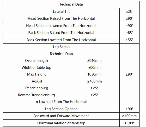 Overall length: 2040mm. Widht of table top: 500mm. Max Height: 1050mm. Adjust: ≥400mm. Trendelenburg: ≥25°. Reverse Trendelenburg: ≥25°.