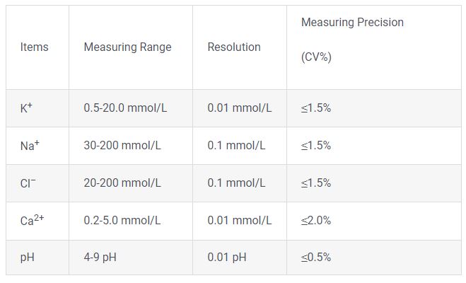 - Test item: K, Na, Cl, iCa, nCa, TCa, pH