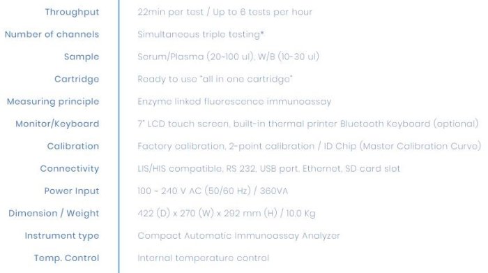 ALFIS-3 is an ELISA based POC immunoassay analyzer. ALFIS-3 has a built-in automated fluorescence scanning system using magnetic beads and alkaline phosphatase enzyme system for the quantitative immunoassay. ALFIS-3 tests are used for measuring the concentration of various analytes in human blood, plasma, and serum. ALFIS-3 tests are in vitro diagnostic tests intended for screening, monitoring and/or routine physical examination in centralized laboratories of hospitals and physician clinics.
