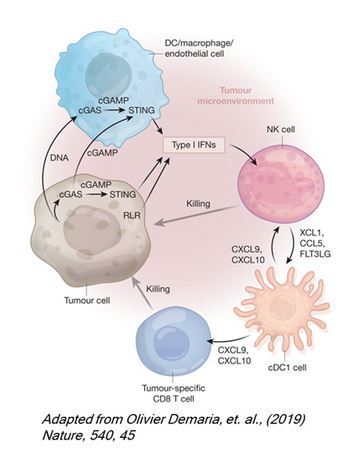 There are 7 signaling pathways that involved in innate immune responses against invading pathogens. Each pathway recognizes distinct molecular pattern released by pathogens. STING is an endoplasmic reticulum-resident transmembrane protein that drives the recognition of one of the molecular patterns, intracellular DNA, to invoke innate immune response. Due to the inherent genomic instability of cancer cells and resulting cytosolic DNA within, STING pathway has been known as an essential pathway for inducing immune responses against tumor cells. Activation of STING (by natural ligand, cyclic GMP-AMP, cGAMP) triggers production of type I interferon in cancer cells, but activation outside the tumor cells (tumor-Extrinsic factor) is required to induced anti-tumor immune responses. First generation STING agonists (analogs of cGAMP) have been evaluated in clinical setting, but overall responses were disappointing, due to low ORR. There is an urgent needs to develop new way to activate the STING pathway.