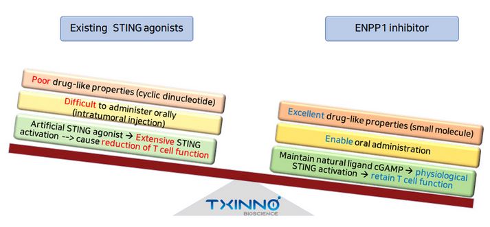 At Txinno Bioscience, we are developing a small molecule ENPP1 inhibitor based on following advantages; 1) in stark contrast to STING agonist, ENPP1 inhibitor would maintain endogeneous cGAMP concentration and exert physiological level of STING activation in TME, and 2) orally available ENPP1 inhibitor can overcome shortcomings of intra-tumoral injection required for current STING agonists