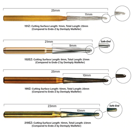 This long, tapered bur prepares a funnel for easy access in the pulp chamber. The non-cutting safe-end prevents the cutting through the canal wall or the pulp chamber floor.