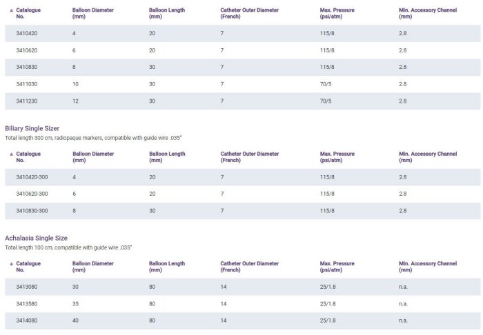 - balloon diameters from 4mm to 12mm (biliary) and 30mm to 40mm (achalasia)
