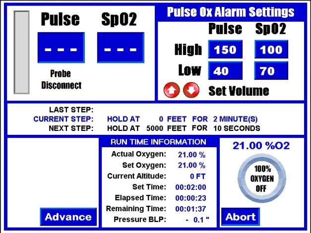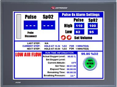 - Output range: User programmable for altitude / oxygen concentration and duration at each step