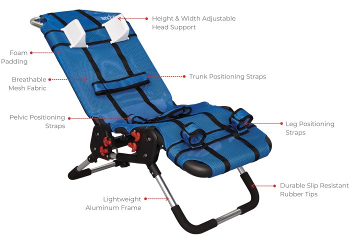 - Positioning straps and head support can be placed anywhere along length of the chair