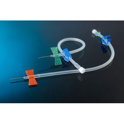 AV fistula needle allows venous and arterial access for patients undergoing hemodialysis. Ultra-thin wall stainless steel needle siliconized on both internal and external surface. Provides optimum penetration profile. Minimizes pain during insertion, maximizes smooth, laminar flow. Kink-resistant tube made of medical grade PVC. Rotating colour coded wings, facilitates flipping of needle while allowing for easy gripping and fixation. Orientation dot on needle hub enables precise manicuring of bevel. Leur has universal 6% taper to allow smooth connection with standard bloodline sets. Packaging: Available in single pack or in pair per pack. Available with or without back eye. Available in red, blue or white clamps. Available with 15 cm or 30 cm tubing. Sizes: 15G, 16G and 17G. Packaging: 50/200 per inner / master cartoon.