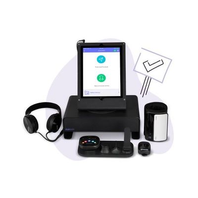 FDA-cleared device and adapters for remote physical exams in on-site clinics. Empowering remote physical exams from anywhere. Tyto device with exam camera and thermometer. Tyto otoscope, stethoscope, and tongue depressor adaptors. Pulse oximeter and blood pressure cuff. iPad® with preloaded software, stand, and headphones. Mobile app and clinician dashboard for conducting remote physical exams, reviewing exam data, and communicating with patients. HIPAA-secure, AWS cloud storage. Travel version includes backpack and portable stand.