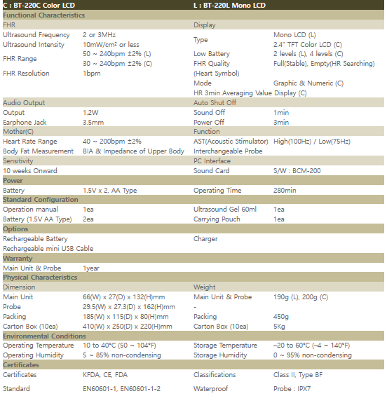 BT-220C/BT-220L is a Fetal Doppler and check mother`s heart rate. Also. accoustic stimulator faction can stimulate the fetus to check more exact status of fetus.
