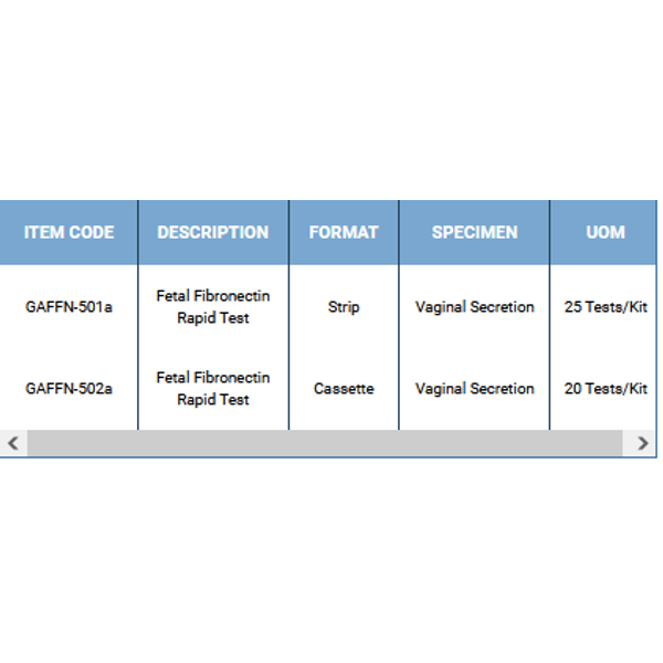 The fetal fibronectin (fFN) rapid test is a visually interpreted, qualitative immunochromatographic test device for detection of fFN in vaginal secretions during pregnancy, which is a special protein that literally holds your baby in place in the womb. The test is intended for professional use to help diagnose the rupture of fetal membranes (ROM) in pregnant women.