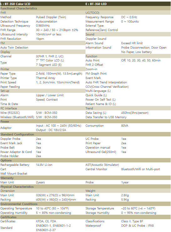 - Especially, the doppler probe has 9 crystal sensers for catching FHR effectively, and it is water-proof type. BT-350 has 2 kinds of instrallation functions such as notebook, and wall mount