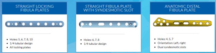 Flower fibula plating options include two straight fibula plate designs and an anatomic distal fibula plate. The low-profile Flower Fibula Plates allow for the use of variable angle locking and compression screws that sit flush within the plate.