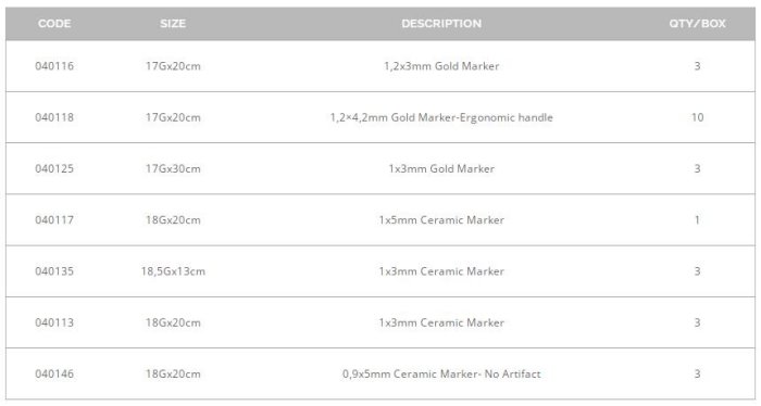 Used to target localization for lesions or organs which move in respect to external anatomy. Pure gold cylinders version specially knurled to inhibit migration. Pyrolytic carbon coated zirconium oxide bar-bell version to reduce the artifacts. Provide visualization under fluoroscopy, X-ray, CT, MRI, ultrasound and other imaging modalities. Preloaded in a pre-waxed tipped needle or in a wax- free special version. Each individually packaged for wide flexibility during the treatment.