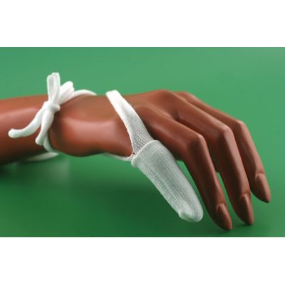 Polyamide. This bandage is presented in a way that allows a quick and easy finger dressing. It is not necessary the use of clip fasteners or adhesives. With ties to close and fix around the wrist. Two sizes: Small for children or little fingers. Large for adults. Shelf box + transport carton.