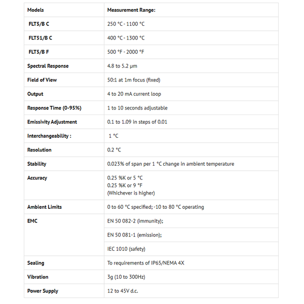 Providing a spectral response from 4.8 to 5.2µm, the FLT5B measures from 250 to 1300 °C / 482 to 2372 °F. This means the thermometer can be used at more points on the line, reducing the number of different types of device needed.