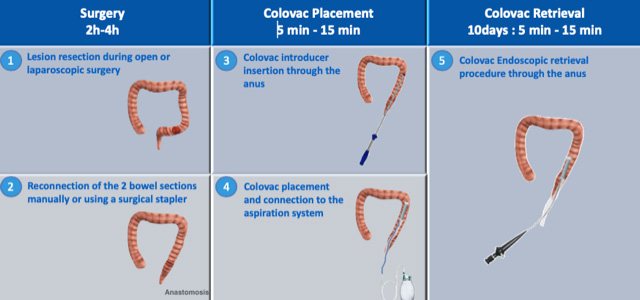 Invented by French surgeon Charam Khosrovani, Colovac is a flexible endoluminal bypass sheath that prevents contamination of the colorectal anastomotic site following open or laparoscopic colorectal surgery. Minimally invasive and fully reversible, Colovac is anchored by a vacuum seal above the anastomosis and can be removed during a routine endoscopic procedure. Clinical trials support Colovac’s effectiveness in improving and expediting patients’ recoveries from surgery. This is an especially important benefit for surgeons, clinicians, payors and postoperative care professionals, and for the community of colorectal patients worldwide.