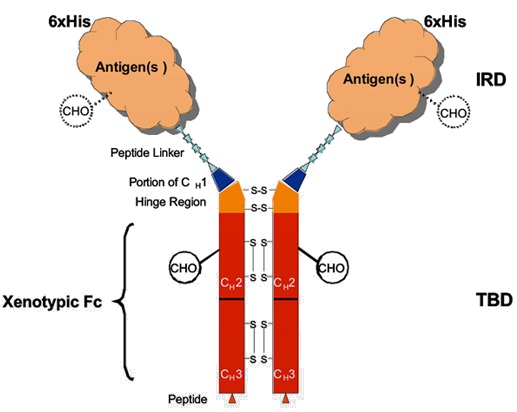 The Chimigen® Platform is a flexible platform vaccine technology designed to elicit both humoral and cellular immune responses in hosts. Chimigen® Vaccines are recombinant proteins that have selected antigens fused to the Fc fragment of a murine monoclonal antibody through proprietary peptide linkers. Chimigen® Vaccines contain two domains, the Target Binding Domain (TBD) and the Immune Response Domain (IRD). This approach allows for efficient substitution of a desired antigen (the IRD) onto the TBD backbone, permitting production of highly desirable and effective multivalent vaccines.