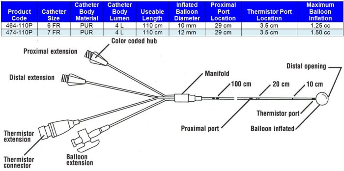 Thermodilution Catheter is made of extruded radiopaque polymeric tubing with four lumens in the catheter body. One lumen is to inflate or deflate the latex balloon which is located at the distal end. The proximal port is located 29 centimeters from the catheter tip. Thermistor port is located 3.5 centimeters from the distal tip. The distal lumen exits at the tip of the catheter, and is used for pressure monitoring.