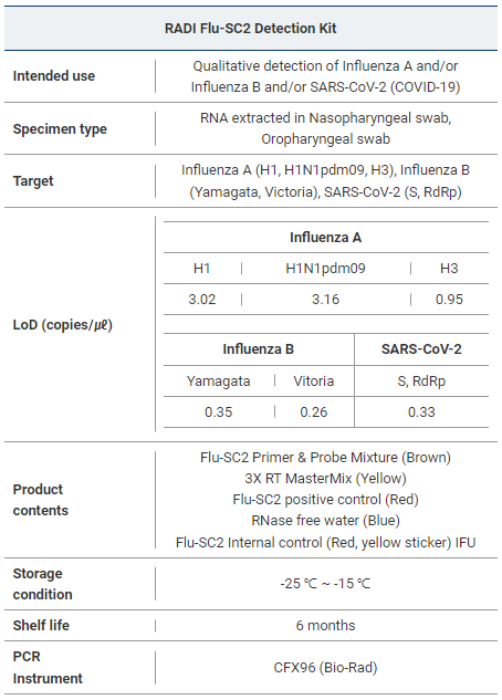 Fast Result and Easy to Use ! Get the result within 100 min for all suspected cases for Influenza A and/or Influenza B and/or SARS-CoV-2 (COVID-19)! The RADI Flu-SC2 Detection Kit is based on Real-time RT-PCR technology utilizing reverse-transcriptase(RT) reaction to convert RNA into complementary DNA (cDNA). It is intended for the presumptive qualitative detection of nucleic acid from the Influenza A virus and/or Influenza B virus and/or SARS-CoV-2 in Upper respiratory specimens such as Nasopharyngeal swab, Oropharyngeal swab. The assay is for use by a laboratory professional trained to use real-time PCR in a laboratory.