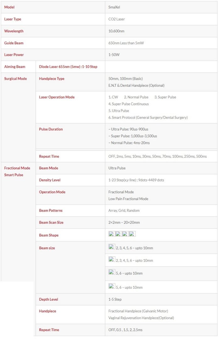 SmaXel with Fractional CO2 Laser. The Fractional CO2 laser with Smaxel trade-mark operates by creating 100 micrometer columns of laser beam in the skin align with the ability to adjust the number of laser beam dots. The Smaxel delivers the laser energy to the target tissue by using a particular double part pulse called SmartPulse. In the first step, a high power ablative pulse with short duration leads to micrometer destruction of tissue which delivers the laser energy into the optimum depth of tissue.