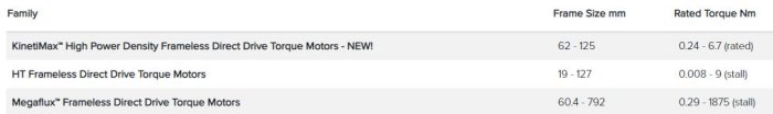 Allied Motion is a technology leader in Frameless Brushless Direct Drive Torque Motors. Allied has developed and manufactures several types of frameless direct drive brushless motors, including a broad range of standard catalog models. Allied is also well-known for the special and completely custom torque motors we have developed. Key characteristics of each family of frameless brushless direct drive torque motors are summarized in the table below. Click the "Details" button to find technical files, including model specs, datasheets, CAD drawings, and installation manuals for each of our brushless direct drive torque motors.