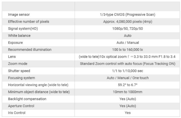Auto focus, 10x optical zoom, Auto white balance, Auto exposure control to counter high intensity of light, Zoom with auto focus tracking, Strategically position to allow unrestricted access to cavity even with multiple surgeons, High Definition image quality, Recorder with usb port, Live Streaming Technology