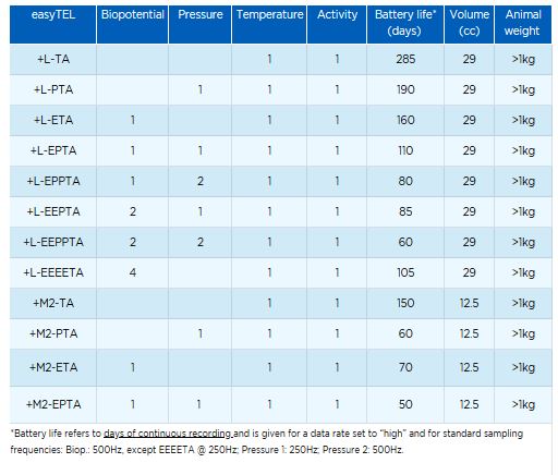 Intended for use in preclinical research (primarily toxicology, pharmacology and safety pharmacology studies) and biodefense, the easyTEL+ implants are ideal for large animals > 1 kg such as rabbits, swine, dogs or primates.