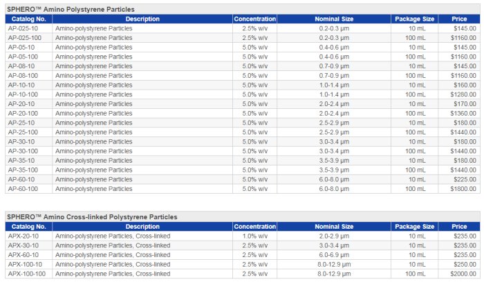 We manufacture a wide variety of uniform amino functionalized particles ranging in size from 0.05 um to 20 um for covalent coupling of proteins or other ligands. Additional information can be found at FUNCTIONALIZED POLYSTYRENE PARTICLES product details.