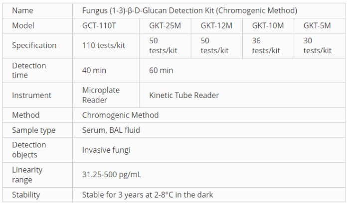 FungiXpert® Fungus (1-3)-β-D-Glucan Detection Kit (Chromogenic Method) is intended for the screening diagnosis of invasive fungal disease. It is used to provide rapid diagnostic reference for clinical invasive fungal infections through quantitative detection of (1-3)-β-D-glucan in the serum and Bronchoalveolar Lavage (BAL) fluid. GCT-110T series are intended for manual operation with microplate reader. GKT-5M/10M are used with our semi-automated instrument MB80 series and fully automated instrument IGL series.