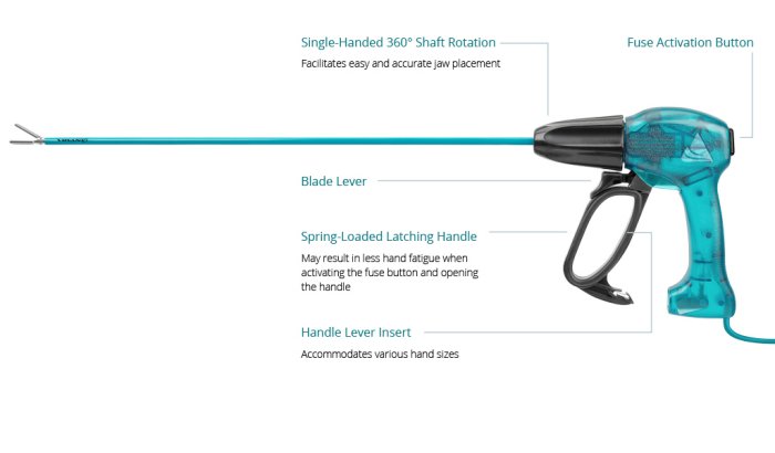 The Voyant 5mm Fusion device effectively seals vessels up to and including 7mm in diameter and tissue bundles in laparoscopic and open procedures. It delivers radio-frequency energy to tissue captured between the jaws and divides sealed tissue with a user-actuated blade. The device is designed for use with 5mm or larger trocars.