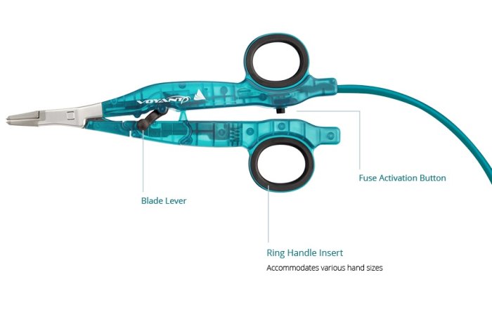 The Voyant Fine Fusion device effectively seals vessels up to and including 7mm in diameter and tissue bundles in open procedures, including head and neck procedures, where working space is limited. It delivers radio-frequency energy to tissue captured between the jaws and divides sealed tissue with a user-actuated blade. The device is designed for use in procedures that require finer jaws.