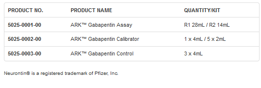 The ARK™ Gabapentin Assay is intended for the quantitative determination of Gabapentin in human serum or plasma on automated clinical chemistry analyzers. Gabapentin concentrations can be used as an aid in management of patients treated with gabapentin.