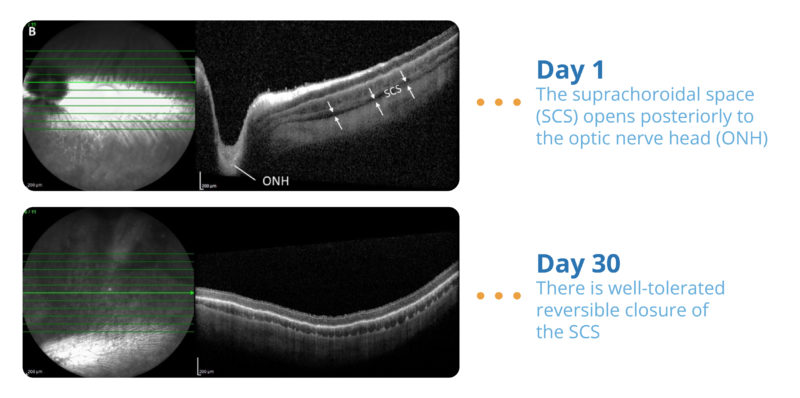 In preclinical animal studies from which data was presented at the American Academy of Ophthalmology 2019 Annual Meeting in October 2019, the suprachoroidal injection of luciferase DNA nanoparticles (DNPs), in rabbits produced activity comparable to that seen from subretinal injections of luciferase DNPs. In these studies, SCS injections of DNPs were generally well tolerated across both rabbits and non-human primates, and no significant abnormalities were observed on ophthalmic exams. DNPs can also transfer large genes at potentially higher doses without the risks of subretinal surgery, which may allow for gene therapy in some of the most common IRDs.